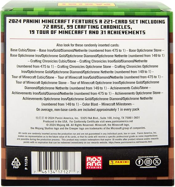 Explore, build, and collect with the Panini Minecraft Mega Box—an officially licensed 2024 Minecraft trading card product. Featuring 60 cards, including foil parallels and rare inserts, this mega box is perfect for fans of Minecraft and card collectors alike. Chase fan-favorite mobs, biomes, weapons, and characters in full-color collectible form. The official Minecraft Trading Card collection features over 200 cards from the influential and iconic game, including characters, mobs and biomes! Find limited-edition parallels — Stone, Iron, Gold, Diamond, Netherite — as well as optichrome versions! Look for ultra-rare Color Blast and Minecraft Milestone cards!